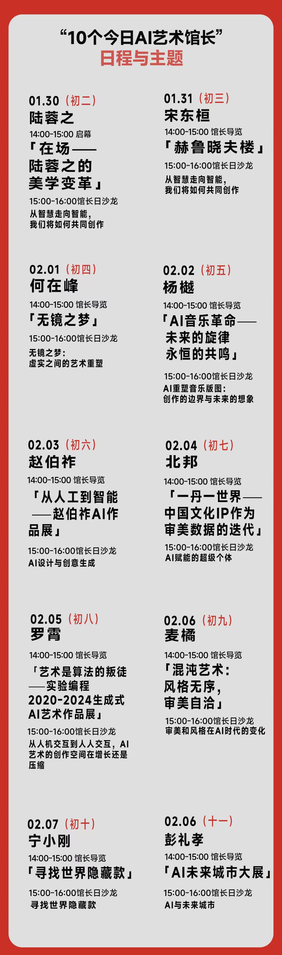 我们相信人工智能使人类拥有前所未有的力量,但同时也带来了前未有的责任。大展邀请了华人第一位女性策展人陆蓉之在内的10位在AI艺术领域具有前瞻思考和实践精神的艺术家推出“10个今日AI艺术馆长”特别策划,他们将通过流动个展、馆长沙龙和VIP导览,与观众分享他们在AI时代的思考。从大年初二-初十一连续10天,每天由1位艺术家担任轮值馆长,在今日AI艺术工场与大家面对面交流,共同探讨AI、艺术与未来的先锋话题。