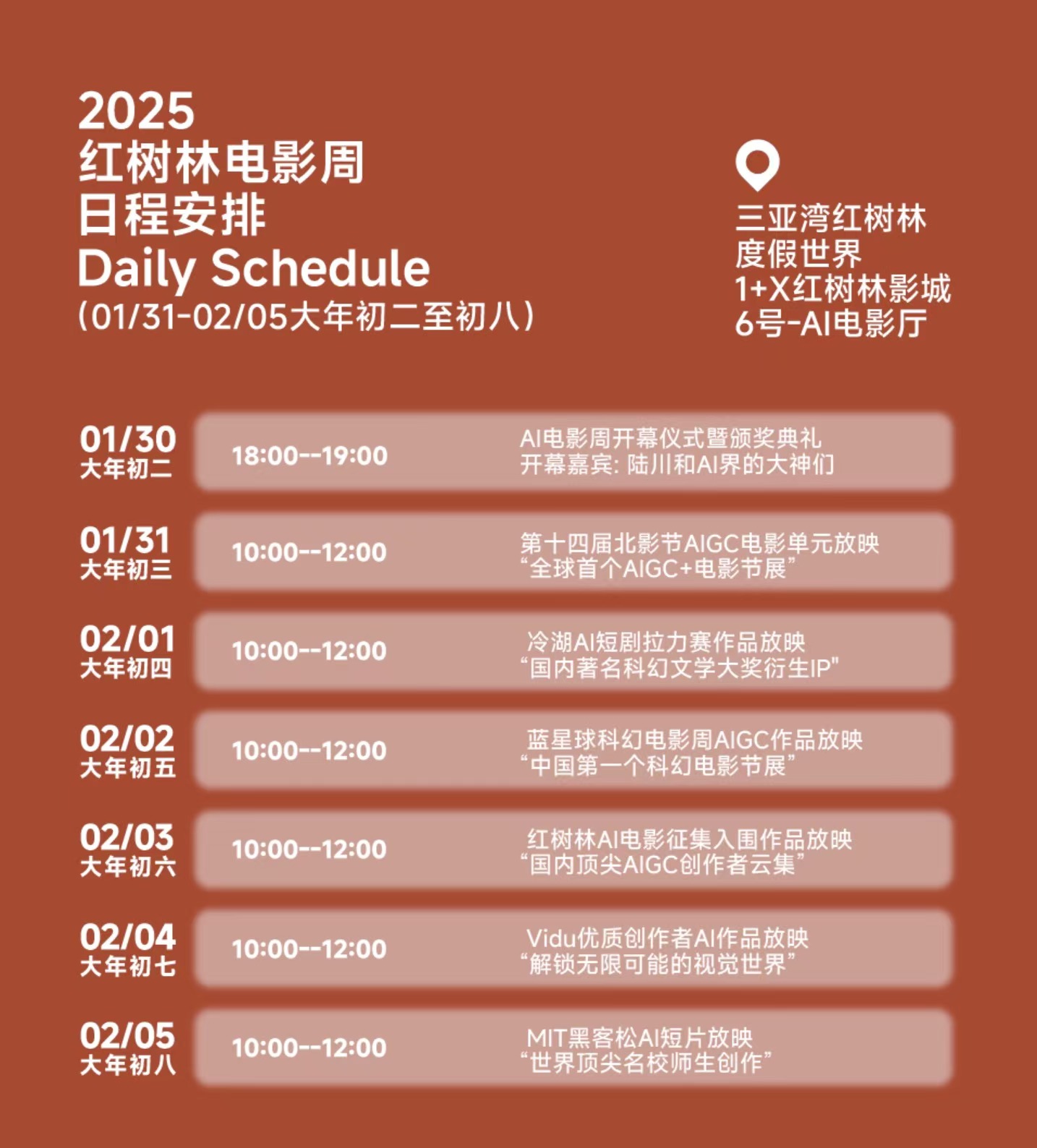 著名导演陆川将在大年初二现身红树林·AI电影周,以大展AI电影周主席身份为大展AI影像类奖项颁奖,并开启为期一周的AI电影奇妙之旅。电影周集结了北京国际电影节AIGC电影单元、冷湖AI短剧拉力赛、蓝星球科幻电影周、MIT黑客松等顶尖AI电影赛事组织、国内首个纯自研视频大模型Vidu及在红树林AI艺术万人展AI电影、AI影像单元入围的80余部优秀AI电影短片进行展映,从大年初三至初八,观众可在1+X红树林影城AI电影专属影厅免费预约观看,准备好和陆川导演一起亲历电影产业新时代了吗?